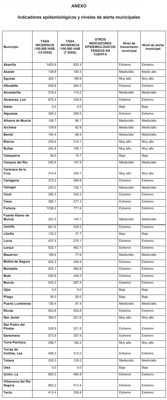 El encuadramiento de la Región de Murcia en el nivel de alerta extremo implica la aplicación en todo su territorio de las medidas regionales previstas para dicho nivel en el artículo 13.4 de la Orden de 13 de diciembre de 2020 de la Consejería de Salud: