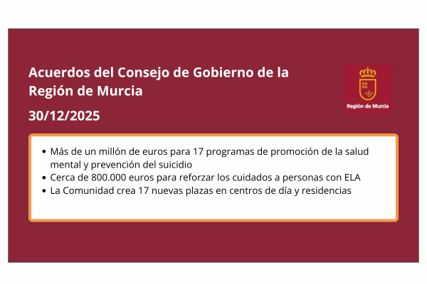 El Consejo de Gobierno, a propuesta del consejero de Salud, ha aprobado el decreto de concesión directa de 1.051.894 euros en subvenciones a 11 entidades con amplia trayectoria en la atención a personas vulnerables, con el objetivo de desarrollar durante 2026 un total de 17 programas de promoción de la salud mental, prevención del suicidio, prevención de los trastornos mentales y asistencia sociosanitaria en la Región.