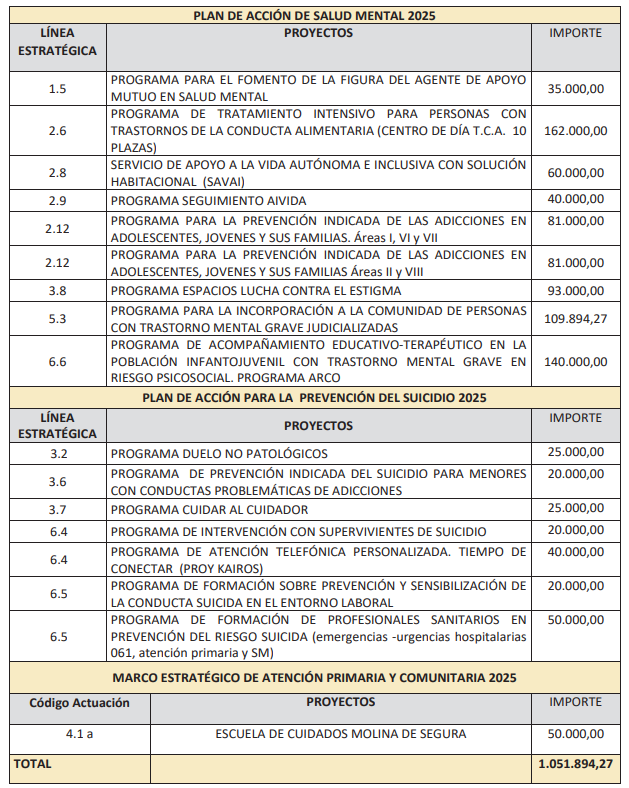 Las 11 entidades beneficiarias de estas subvenciones que llevarán a cabo los programas son la Fundación SoyComotu; la Asociación Internacional Teléfono de la Esperanza; la Asociación Albores; la Federación de Salud Mental de la Región de Murcia; la Fundación Solidaridad y Reinserción Proyecto Hombre Murcia; la Asociación Colectivo La Huertecica para el Seguimiento y Apoyo de Jóvenes y Adultos; la Asociación Murciana de Rehabilitación Psicosocial (ISOL); el Colegio de Psicólogos de la Región de Murcia; la Fundación Española para la Prevención del Suicidio; la Asociación de Anorexia Nerviosa y Bulimia de la Región de Murcia (Adaner) y el Ayuntamiento de Molina de Segura. La financiación procede de fondos del Ministerio de Sanidad.