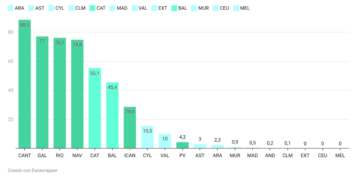 Entre el 20% y el 60%: Cataluña (55,1%), Islas Baleares (45,4%) y Canarias (28,6%).